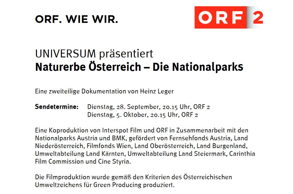 Anlass für den „Universum“-Zweiteiler „Naturerbe Österreich – Die Nationalparks“ ist der 50. Jahrestag der Unterzeichnung der „Heiligenbluter Vereinbarung“, in der sich die Landeshauptmänner von Kärnten, Salzburg und Tirol auf die Errichtung des ersten österreichischen Nationalparks verständigten. In opulenten Bildern erzählt die zweiteilige „Universum“- Dokumentation am Dienstag, dem 28. September bzw. 5. Oktober, jeweils um 20.15 Uhr in ORF 2 von den Errungenschaften der vergangenen Jahrzehnte, aber auch von den Herausforderungen, denen sich die Nationalparks heute neben dem Bewahren der unberührten Natur zu stellen haben.