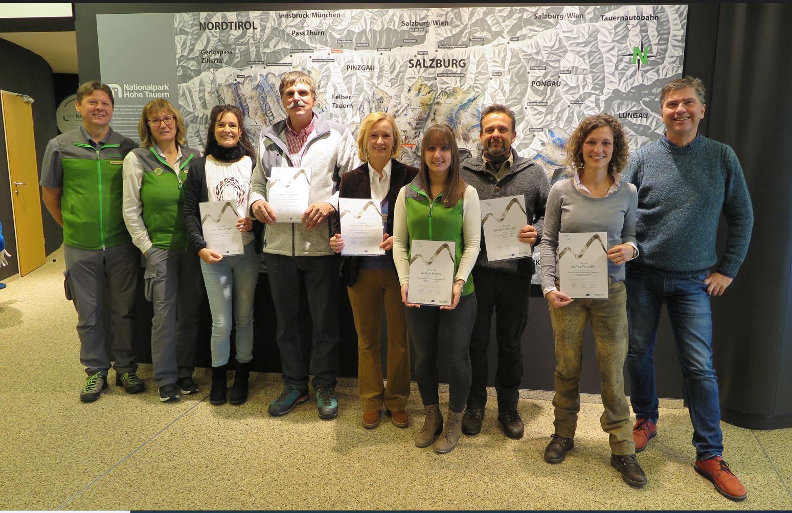 Fotocredit c NPHT/Gfrerer: Johann Keuschnig, Prüfungskommission Stellv. Direktor Nationalparkverwaltung Kärnten; Ruth Bstieler, Prüfungskommission, Petra Heinz-Prugger, Anton Presslaber, Hedi Mayr-Hassler, Kathrin Fercher, Hannes Wiesinger, Andrea Fürstaller und Robert Lindner, Prüfungskommission, Direktor Haus der Natur Salzburg.